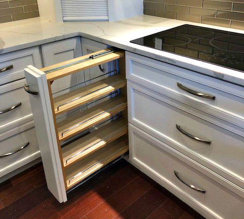 So many great options are available and every cooks wish list will be different. The basics, trash rollouts, sliding shelves and trays, tray dividers. More sophisticated, hanging pot racks, spice pullouts, mixer shelves, pull down racks for wall cabinets are a few. When it comes to drawer inserts there are knife blocks, cutting board, two tiered storage and bread drawer inserts just to call out a few!